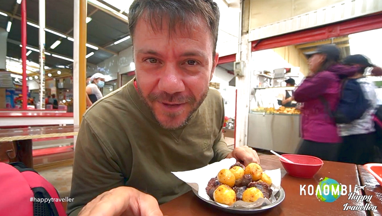 Ο Ευτύχης Μπλέτσας δοκιμάζει κάτι που για πολλούς θεωρείται ιδιαίτερα περίεργο. Το μαύρο λουκάνικο της Κολομβίας, τη morcilla. Δεν πρόκειται για κλασικό λουκάνικο. Είναι έντερο γεμιστό με ρύζι, λίγα ρεβύθια και το χαρακτηριστικό σκούρο χρώμα που προέρχεται από αίμα χοιρινού. Σερβίρεται απλά, συνοδεία καυτερής σάλτσας, και τρώγεται είτε με οδοντογλυφίδα είτε κατευθείαν με το χέρι.