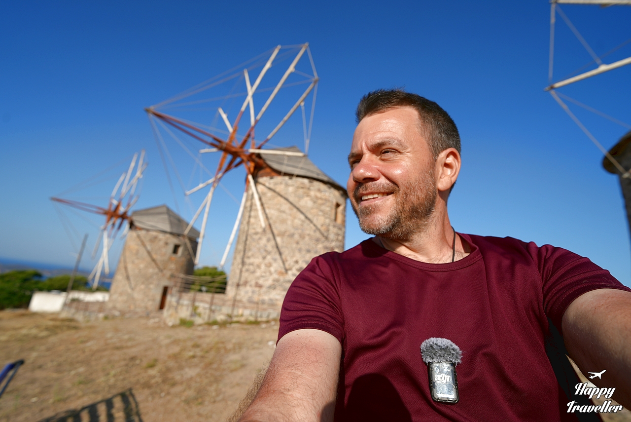 Ο Ευτύχης απολαμβάνει τη θέα από τους ιστορικούς ανεμόμυλους της Πάτμου .’Ενα από τα πιο εμβληματικά σημεία του νησιού.
