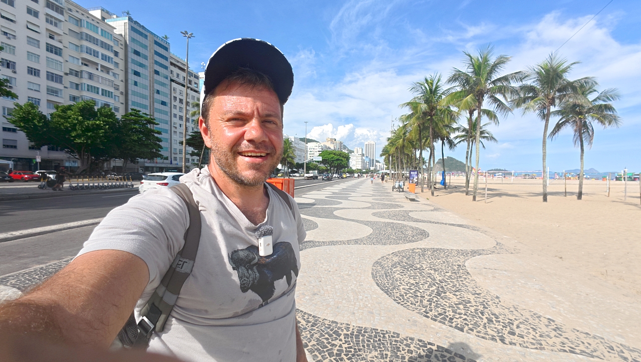 Ο Ευτύχης περπατά στον πεζόδρομο της παραλίας Copacabana στο Ρίο, με το χαρακτηριστικό ασπρόμαυρο κυματιστό μοτίβο στο δάπεδο.